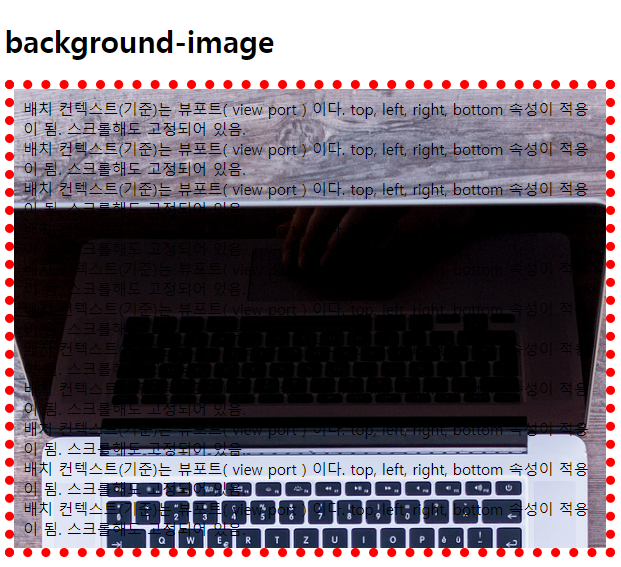 border-box: 기본, 배경이미지가 border(테두리)까지 차지함.