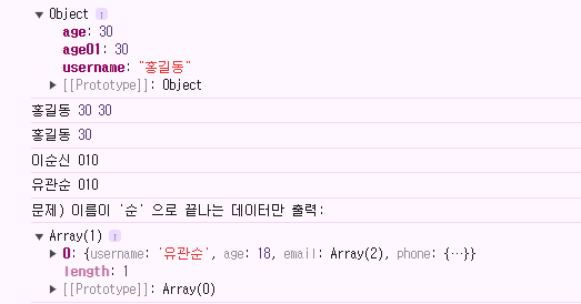 console.log("문제) 이름이 '순' 으로 끝나는 데이터만 출력: ");