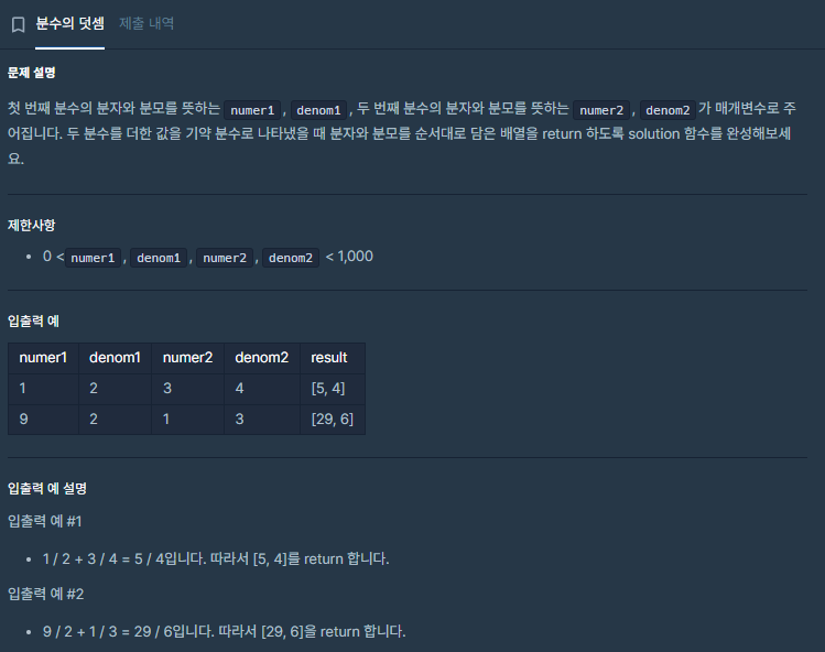 Q. 첫 번째 분수의 분자와 분모를 뜻하는 numer1, denom1, 두 번째 분수의 분자와 분모를 뜻하는 numer2, denom2가 매개변수로 주어집니다. 두 분수를 더한 값을 기약 분수로 나타냈을 때 분자와 분모를 순서대로 담은 배열을 return 하도록 solution 함수를 완성해보세요.