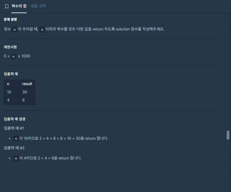 Q. 정수 n 이 주어질때, n 이하의 짝수를 모두 더한 값을 return 하도록 solution 함수를 작성해주세요.